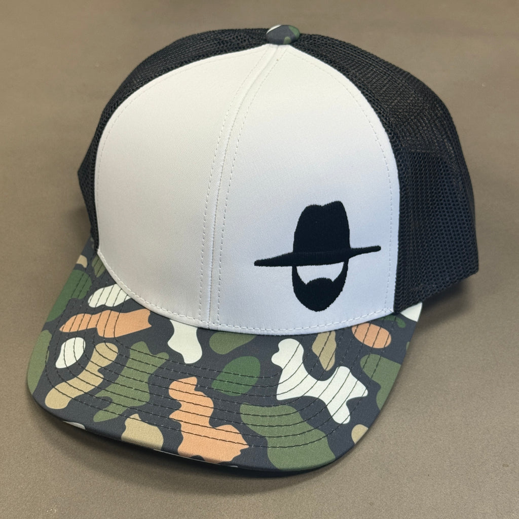 This *NEW* HAT features a White Black trucker hat design with a unique multi-color duck camo bill. Expertly crafted for style and durability, this hat is perfect for those who want to make a statement while staying comfortable.